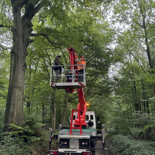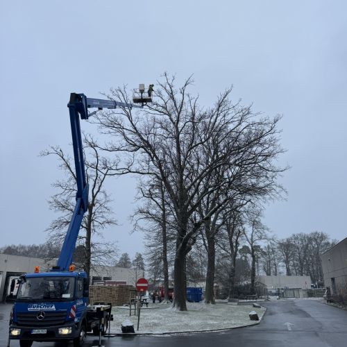Unsere Arbeiten führen wir je nach Situation in Seilklettertechnik (SKT) oder mit eigenen modernen Hubarbeitsbühnen aus. So können wir sowohl in sensiblen Bereichen als auch bei großen Höhen sicher, effizient und baumschonend arbeiten.
